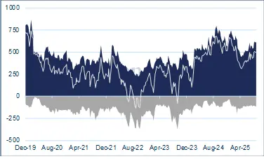 - Global identifiable silver inventories stood at 38,432t at the start of the year, according to Metals Focus. On the basis of our estimate for the 2025 market balance they should now be roughly 35,000t, of which almost half is on COMEX
