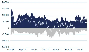 The silver position is different, with outright longs of 8,235t just 3% higher than the 12-monthaverage, while the outright shorts (2,197t) are 8% below the 12-month average.