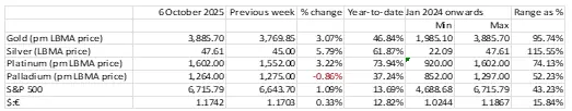 Gold: the latest figures from the World Gold Council, up to Friday 26th September, show yet another gain, this time of 27.2t in the week. Again, the majority of the increase was in North America, with a 17.4t, a 5.0t gain in Europe and one of 4.6t in Asia. Year-to-date, the regional changes were as follows: North America, 332.5t; Europe, 142.6t; Asia, 106.1t; that is 20%, 11% and 49% respectively.