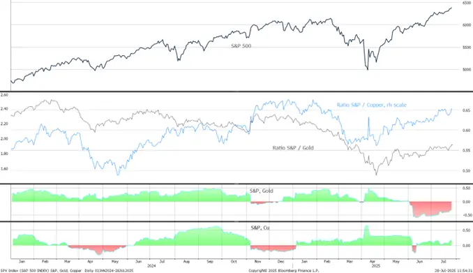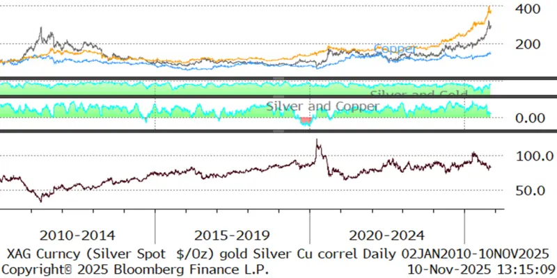 Gold, silver, copper correlations: silver and gold up sharply to 0.83; silver and copper, dropping hard to 0.16