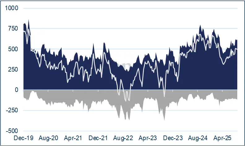 CFTC: - As of 23rd September, the net gold long position among COMEX Money Managers was broadly unchanged over the previous four weeks – in a range of 509t to 499t, which is the most recent figure. At 618t, the outright longs were only 17t higher than the 12-month average and so there is no real overhang there. At 119t, the outright shorts were 13% higher than their 12-month average of 105t.