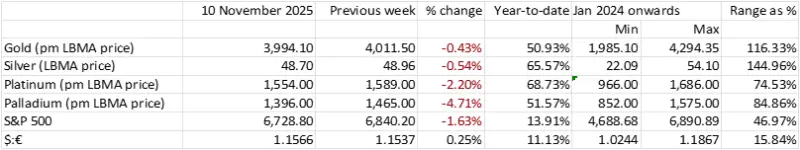 World Gold Council figures to last Friday 7th November showed a ytd gain of 677t to a total of 3,896t. In dollar terms this is a net inflow of $72.4Bn. Regionally, North America has taken in 392t (24%), Europe, 113t (9%) and Asia, 165t (76%). In the week to last Friday the moves were all small with North America a small seller while Europe and Asia added small amounts.