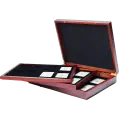Elegant case with mahogany-colored wood finish for storing 8 gold bars in blister packs (86 × 54 mm). The lid is padded with black satin, and the base has a velvety surface. An integrated tilt mechanism makes removing the bars especially convenient. Outer dimensions: 305 × 245 × 30 mm.
